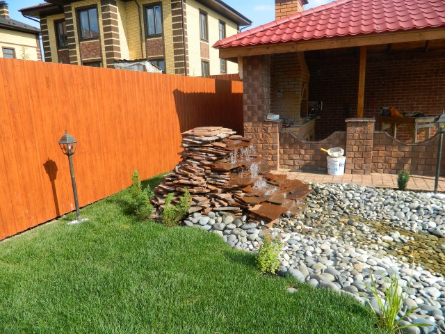 Водопад. Такой элемент эффектно дополняет созданный на участке пруд. Особенно, если оформлен он был на холмистом участке. Если же поверхность ровная, то «исказить» её искусственно для специалистов труда не составит. Проектирование водопада проводится одновременно с водоёмом, чтобы в дальнейшем не возникало проблем с его установкой.